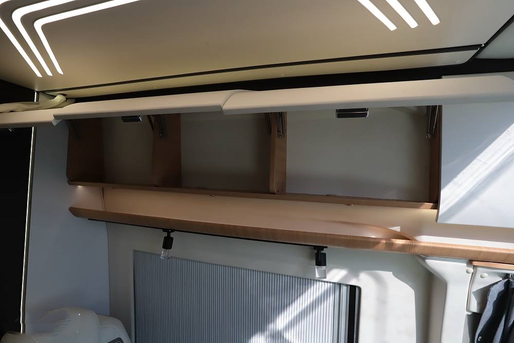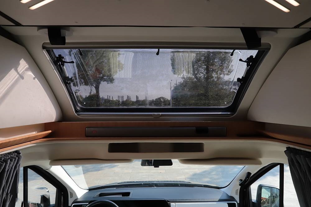 也正是得益于超大內(nèi)高,以往在B型房車上很難實現(xiàn)的兩張大床,在這款車上輕松實現(xiàn)了。如果不告訴你座椅上方還有一張隱藏式吊床,其實是很難發(fā)現(xiàn)的,利用加高頂做內(nèi)嵌式處理,完全隱藏式安裝,一體性非常棒。吊床尺寸為1900×1200(mm),完全放下后到車頂?shù)膬舾咦阌?0cm。