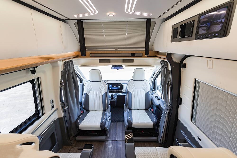 顯眼的雙聯(lián)式中控大屏是中控臺的絕對亮點,支持多媒體播放和導(dǎo)航功能,其余配備電動電加熱后視鏡、主副駕安全氣囊、倒車影像+倒車雷達、四路監(jiān)控、流媒體后視鏡、ESP、定速巡航、自動大燈、自動雨刮、胎壓監(jiān)測系統(tǒng)、多功能方向盤等豐富的輔助駕駛功能,提高了行車安全性和便利性。主副駕駛座椅均采用商務(wù)座椅風(fēng)格,座椅表面由超纖包覆,乘坐舒適感頗佳,主副駕駛均可向后旋轉(zhuǎn),方便與后排座椅組成對卡座布局。
