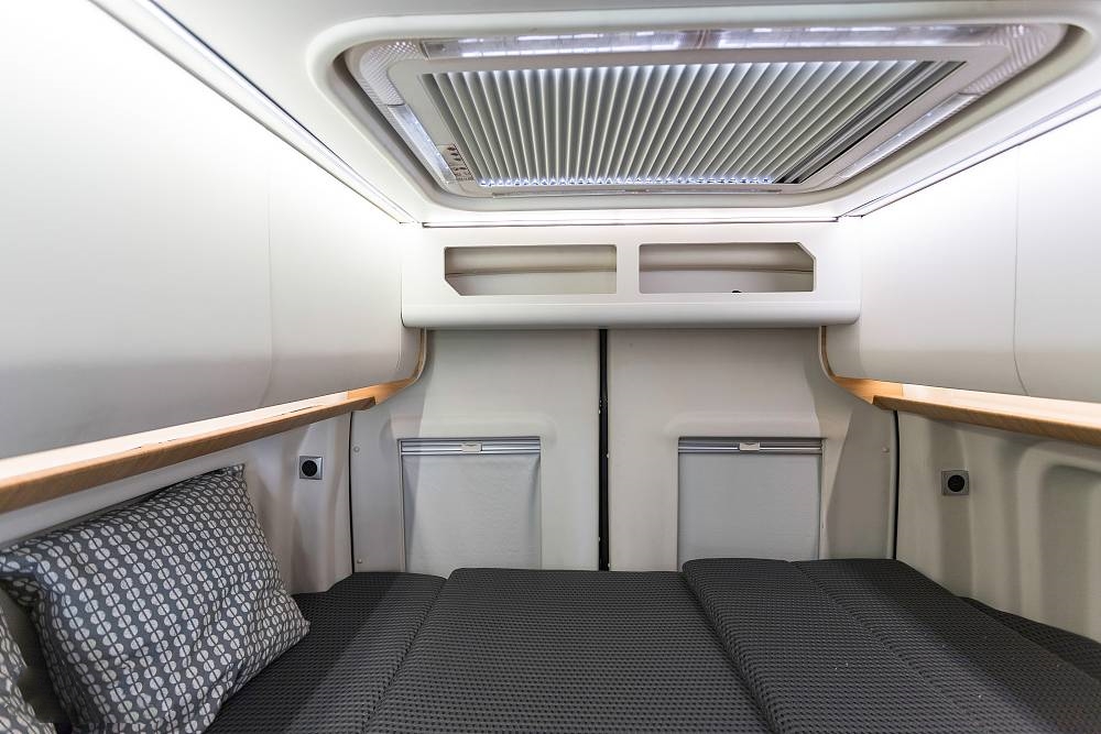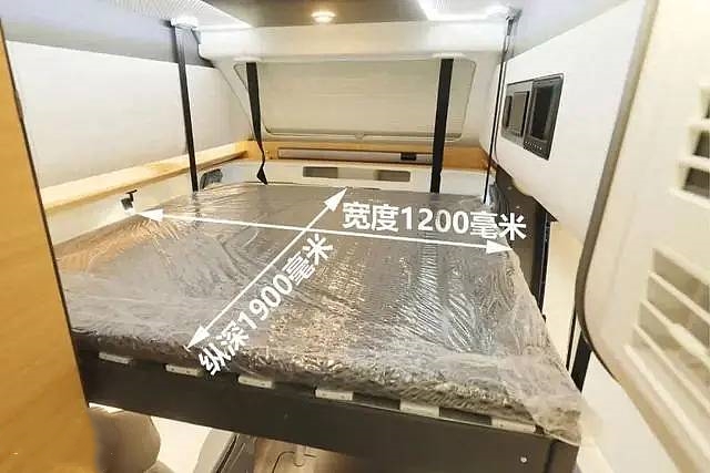 尾部翻折橫床尺寸為2000×1300(mm)容納兩名成年人完全沒有問題,床鋪中間部分可上翻,形成前后貫通式走廊,兩側(cè)窗戶處改為封閉結(jié)構(gòu)并進行了軟包處理,并留有閱讀燈及各種氛圍/射燈照明。