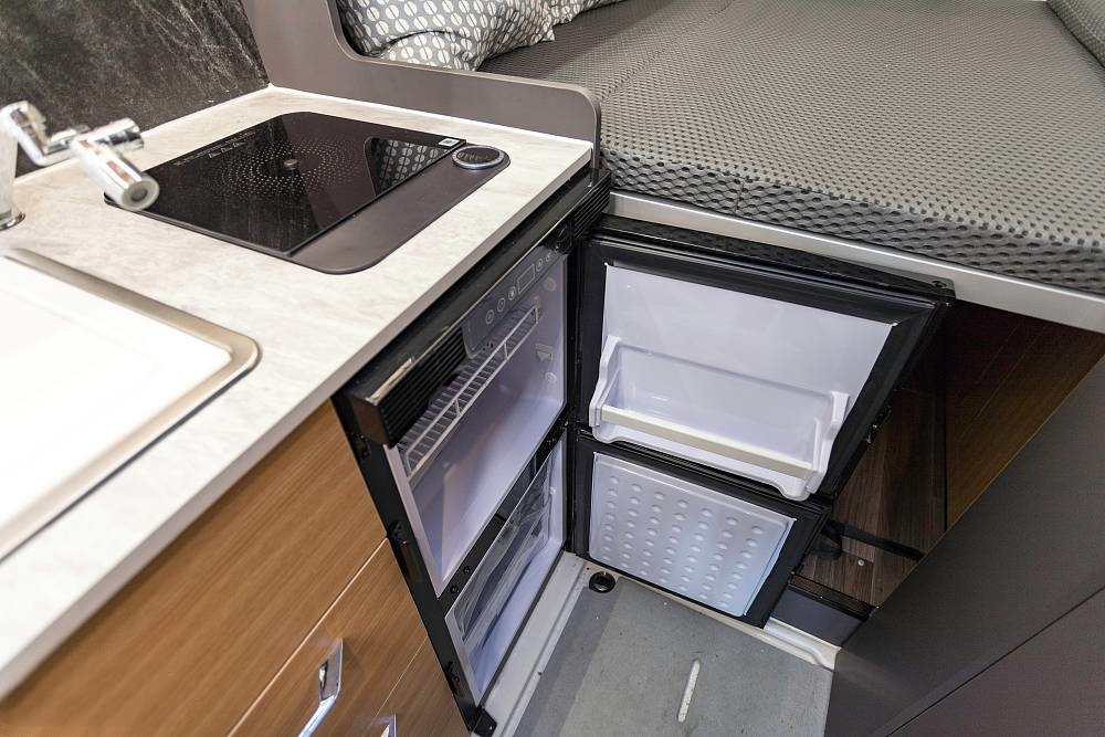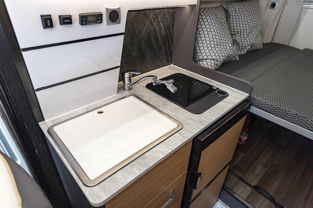 航空座椅后方便是廚房區(qū)、衛(wèi)浴區(qū)和尾置橫床,廚房區(qū)整體布局相對簡單精致,臺面上放置了帶蓋板的不銹鋼水盆、多功能龍頭和電磁爐,日常制作簡單食物或冷餐綽綽有余。下方有一個98L房車專用冰箱,上方為一臺KME房車專用48V行駐車空調(diào)。
