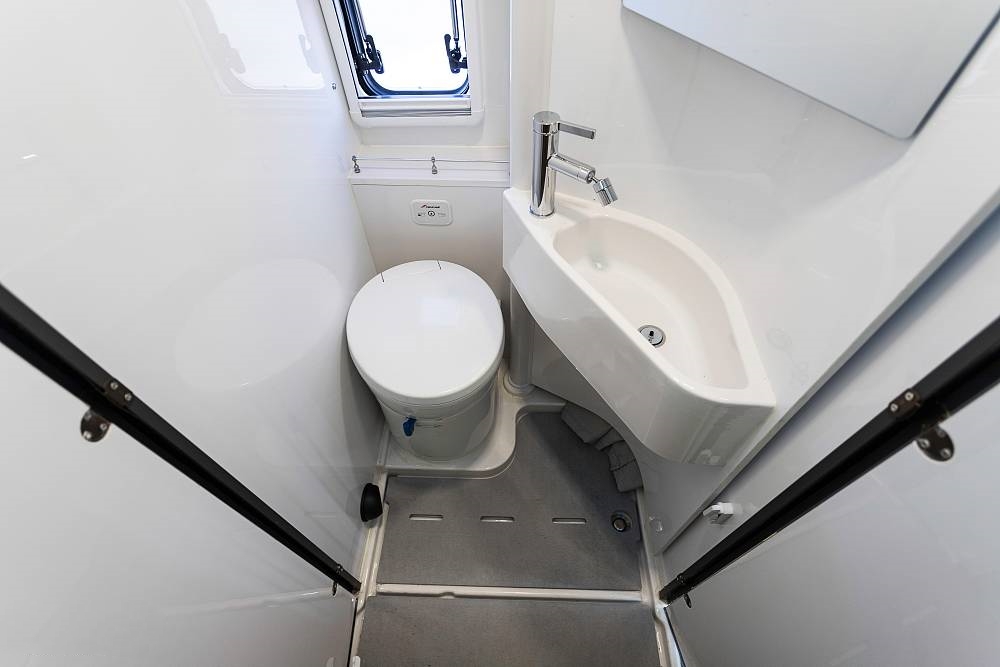 沒看到福特T8實車前我就非常好奇一輛B型房車怎么實現(xiàn)衛(wèi)生間的干濕分離,當(dāng)真站到實車中看到實現(xiàn)的方法時,心底頓時對設(shè)計人員的靈巧構(gòu)思感到佩服,過道空間雙重利用,解決了過道狹窄和衛(wèi)浴空間不足的傳統(tǒng)痛點,一舉兩得。