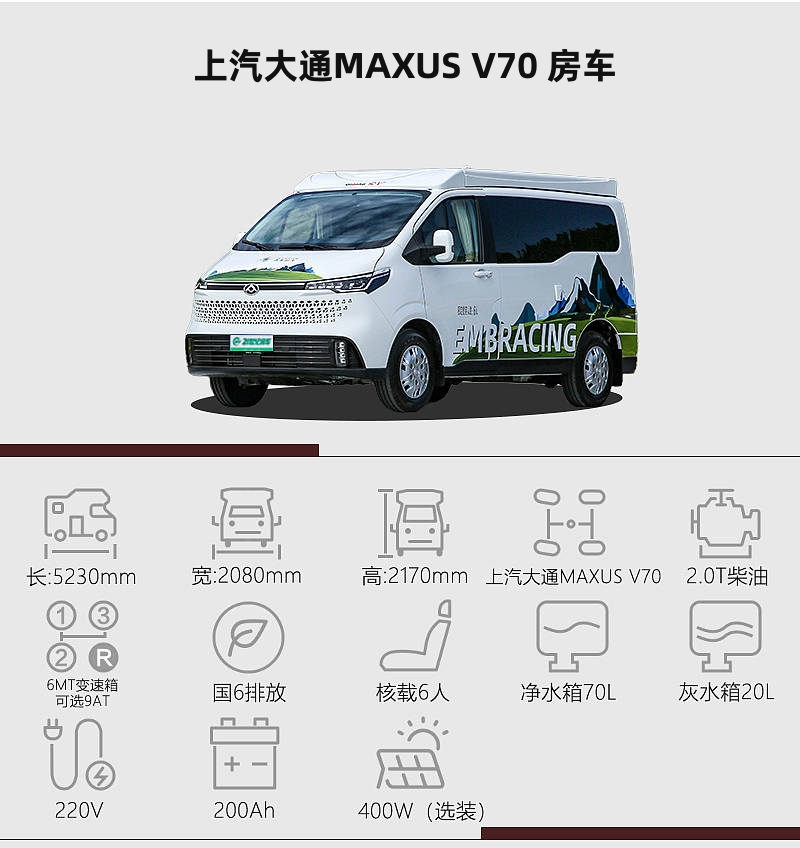 上汽大通MAXUS V70是上汽大通在2023年上市的全新車型,也是上汽大通MAXUS全新平臺架構打造的新產品,新車定位輕客,采用了更為年輕時尚的設計語言,結合整車特點,上汽大通MAXUS V70是一款非常適合改裝B型房車、露營車的底盤。
