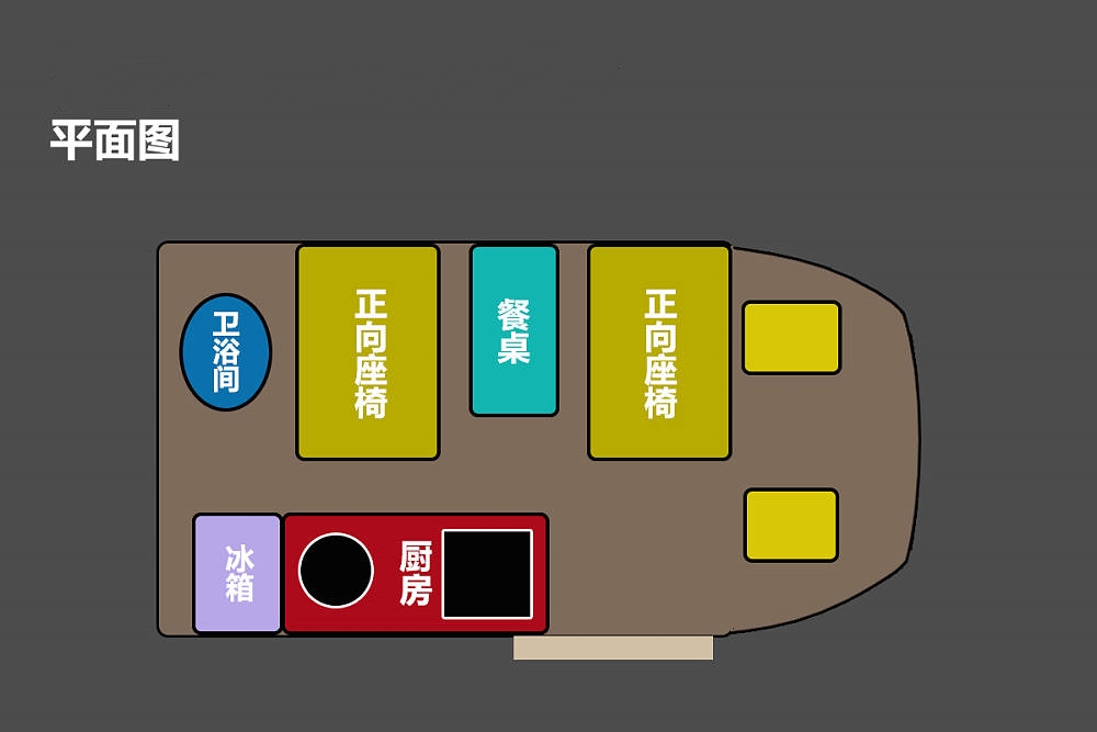 生活區由會客區、廚房區、尾置衛浴間、車頂床鋪組成,別看車型緊湊,核載人數依然能夠達到6人。