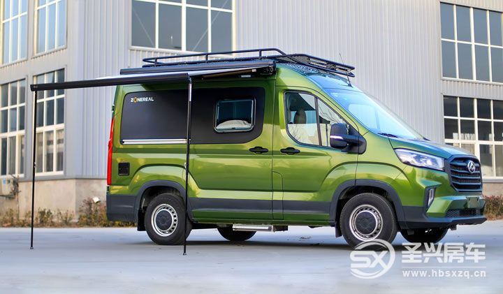 獵裝版車身高度為:2755mm,屬于高頂車型,車頂配備了定制行李架和側面爬梯架,車頂行李架集成了200W太陽能電池板和LED高亮度射燈,可以在車頂遠眺風景的同時提供更好的安全行車照明。 標配了手動遮陽棚,延展尺寸為3000×2500(mm)。