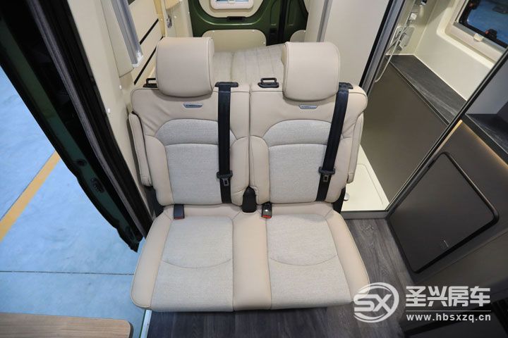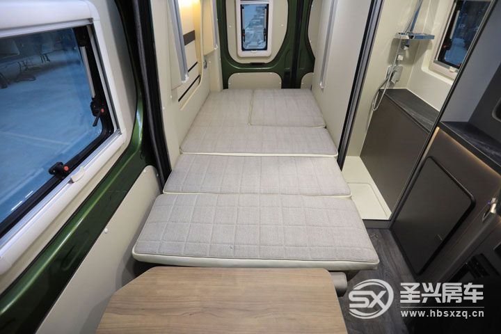 布局合理,后排座椅緊挨著的是休息區,座椅放倒以后和后部的空間形成一張單人床,左側為獨立衛浴間。
