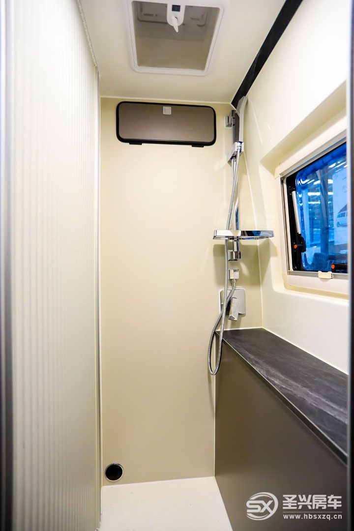 衛浴間采用鋁合金卷簾門,內部設有便攜式馬桶及淋浴噴頭裝置。衛浴間內車頂設有大尺寸雙向排風扇,側面設有超大尺寸組合外推窗。