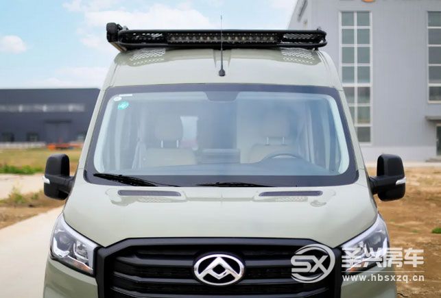 為了更適合戶外野營生活,這款車還配備了2800X1700mm定制的行李架和側面爬梯架,車頂行李架集成了200W太陽能電池板和LED高亮度射燈。