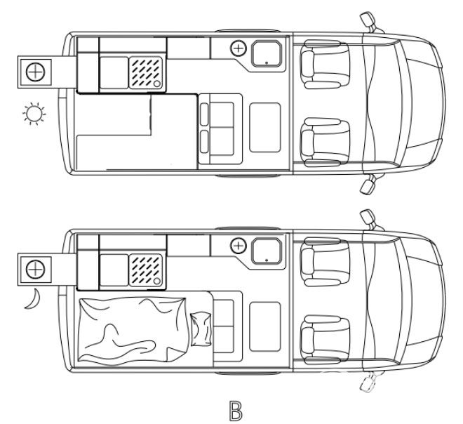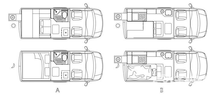 當然,上裝設計不僅局限于以上介紹的布局,為讓房車愛好者有更好的體驗,以下兩款布局可選。A版是大橫床的設計,B版是縱床上下鋪的布局。