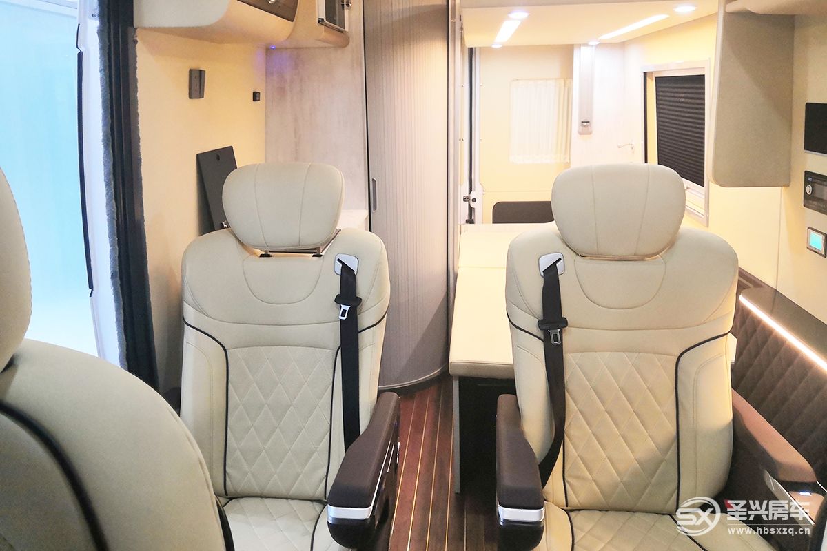 會客區(qū)提供兩張航空座椅,支持多向角度調(diào)節(jié),且配有腿托。兩側(cè)扶手內(nèi)嵌有手機無線充電板,主副駕駛座椅后方的折疊桌板,也能滿足后排乘客移動辦公的需求。