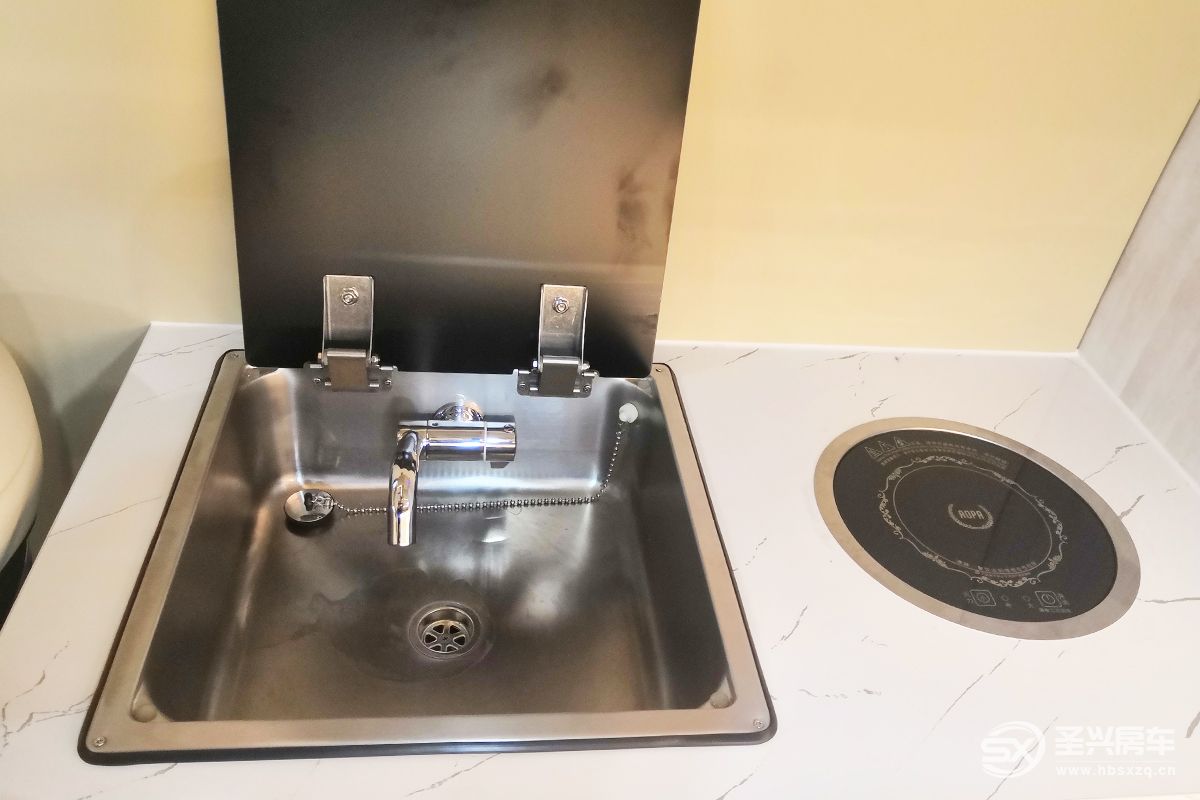 后方廚房區(qū)臺面內(nèi)嵌帶蓋洗手池和電磁爐,頂部還配有微波爐,滿足用戶制作簡餐訴求。臺面下方放置了一臺49L冰箱,便于旅居中存放速凍食材。