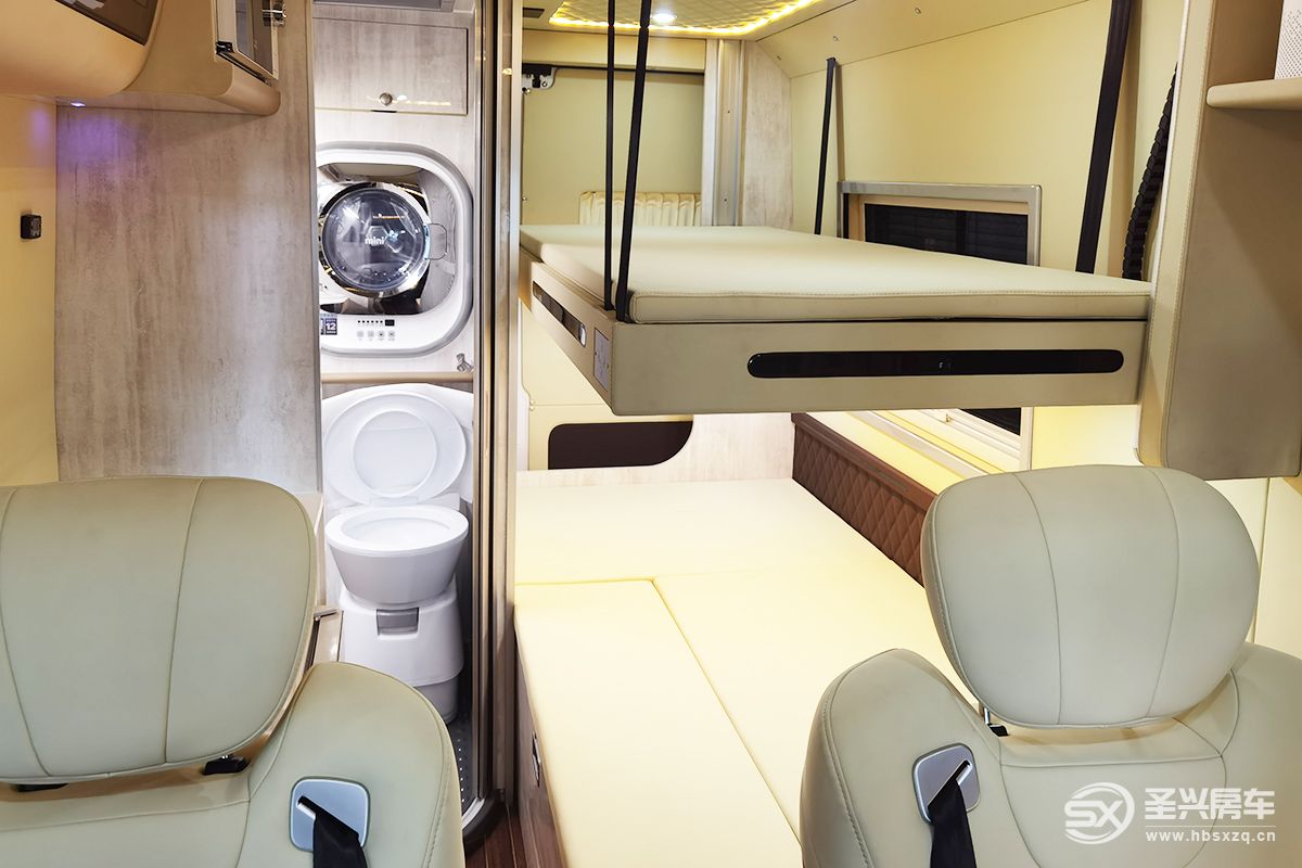 新車衛(wèi)浴間采用縱向布局,以節(jié)省車內(nèi)空間,主要配置包括多美達電動馬桶、扇形洗臉池、肥皂盒、牙杯架、衛(wèi)生紙架、洗衣機、淋浴花灑、浴巾架和化妝鏡,日常使用完全夠用。除此之外,衛(wèi)浴間頂部還配備了韓國大宇mini洗衣機,解決了用戶換洗衣物的問題。