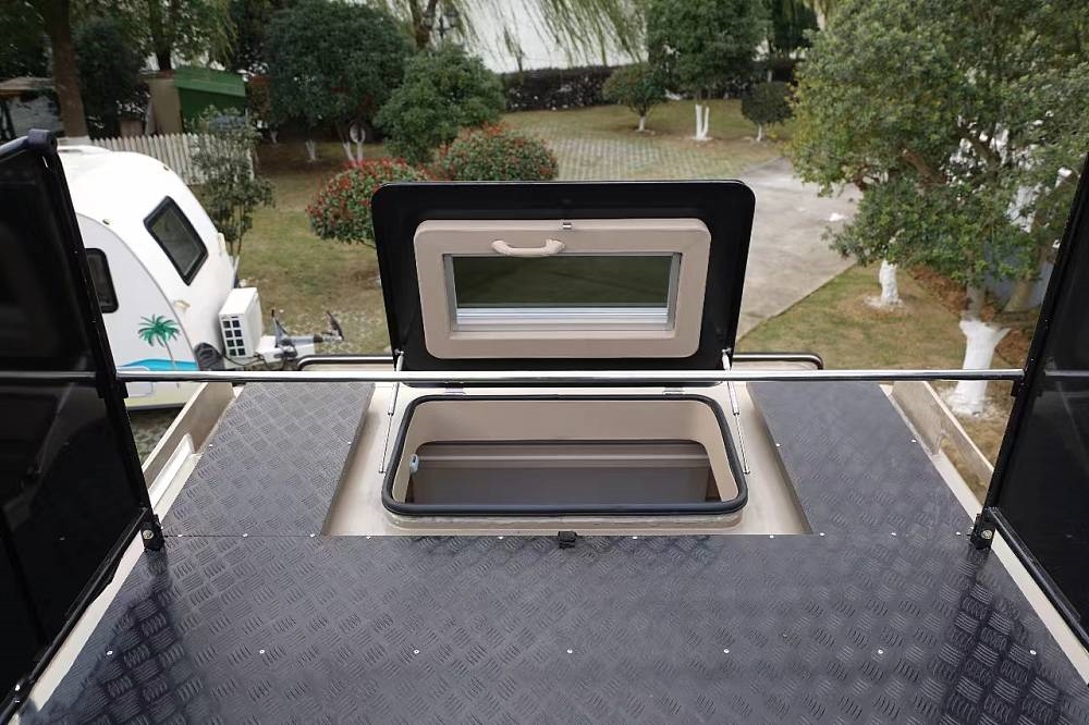 在后置橫床區頂部設置了類似天井的功能結構,通過放置可移動裝卸的臨時爬梯完成車廂與車頂觀景平臺的聯通。