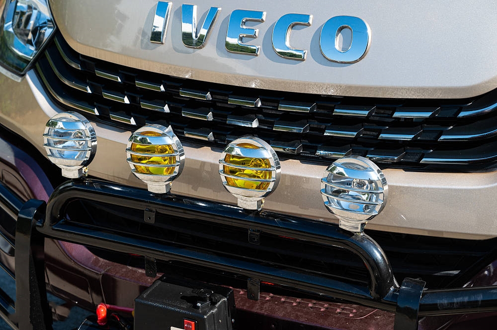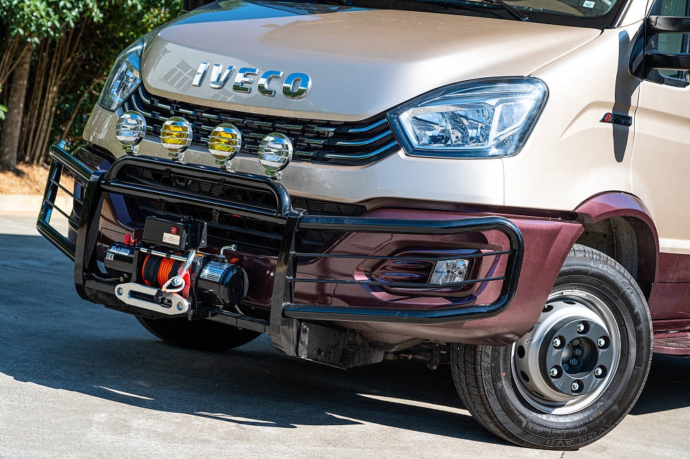 前臉在原有依維柯家族化設計特征基礎上并未做太多改變,橫向的鍍鉻飾條與大燈相連對于延展車頭的視覺寬度起到了不錯的效果,搭配簡潔有力的前大燈組更加炯炯有神。