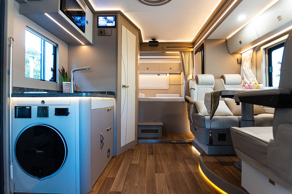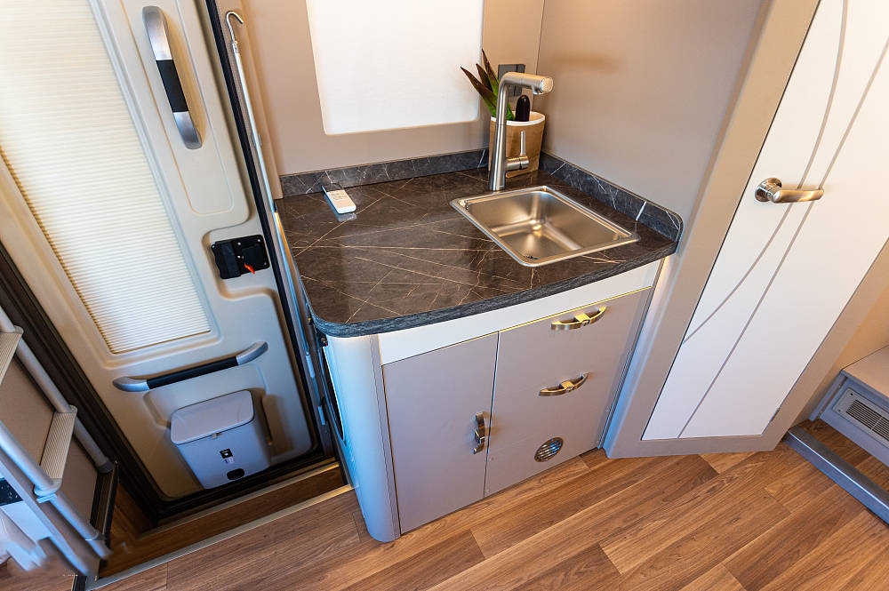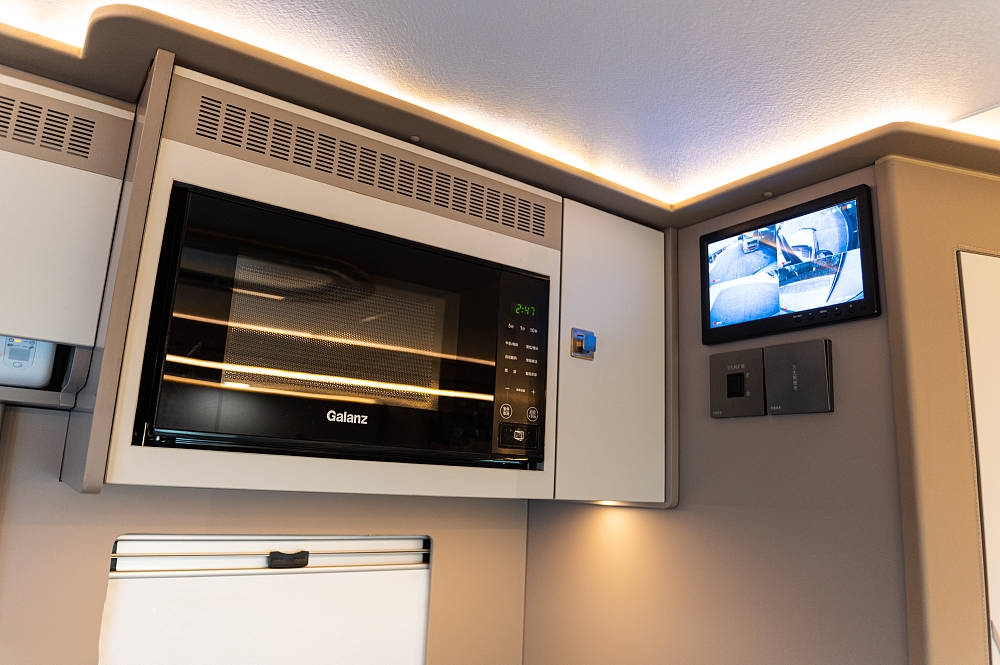 廚房區臺面內嵌有不銹鋼洗手池與與全尺寸龍頭,左側操作空白區域搭配隨車電磁爐和上部微波爐,可快速加熱餐食、制作簡餐更加便捷快速。