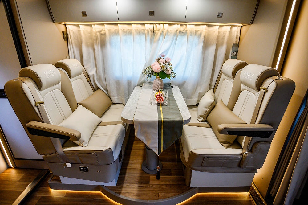 從前到后的布局依次為駕駛室+額頭床、會客區+沙發床、廚房區、衛浴區以及后置拓展橫床,布局形式充分利用大尺度車廂空間,整車內部空間寬敞舒適,可滿足六人在車內同時起居,各項功能區的劃分也比較規整。