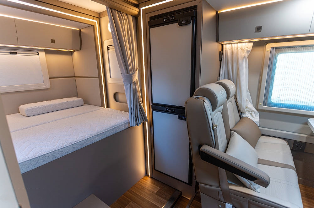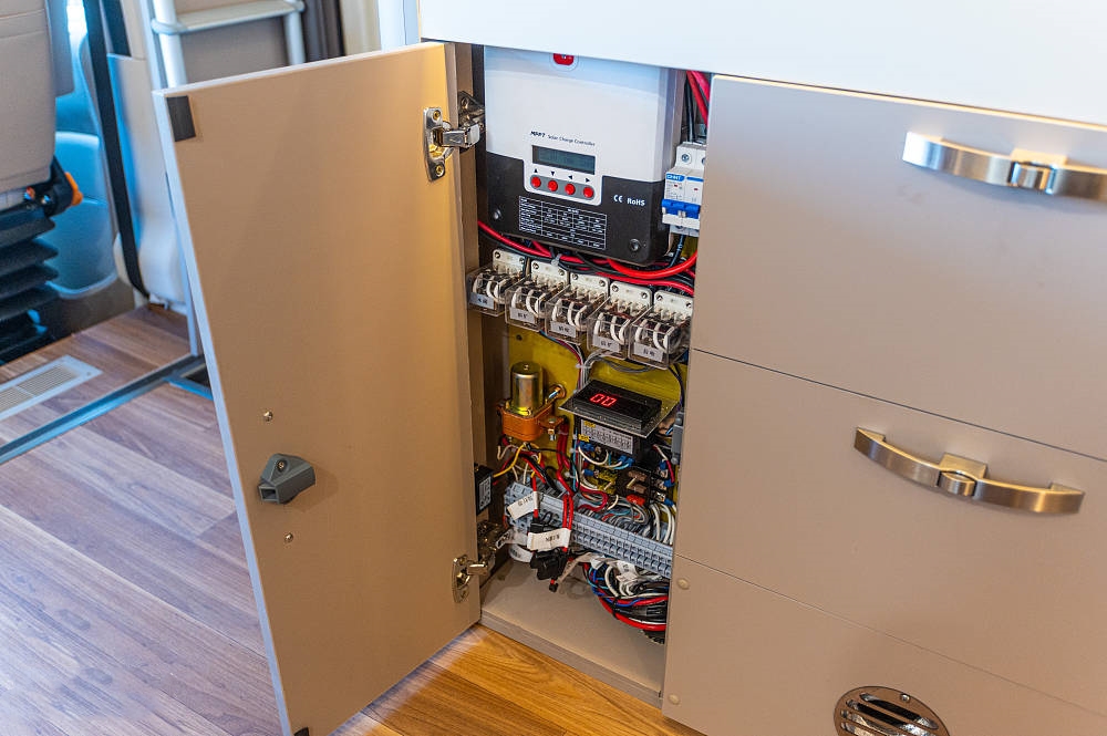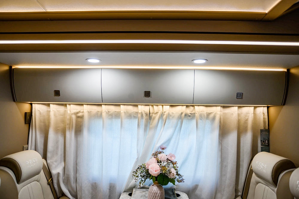 車廂進門上方吊柜中內嵌有一臺家用變頻空調,應用在房車這樣面積可控的空間內,可快速安靜的調控車內溫度,避免忍受酷熱夏日較長時間的降溫過程。