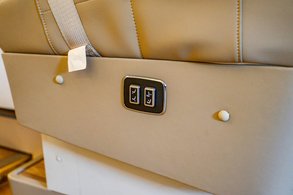 會客區的側拓展區域放置了灰米色對卡座沙發,方便在此用餐、辦公、娛樂等,橫向空間打開后,使得在坐墊長度、厚度以及邊緣腿部承托力方面都能進行全面強化,座椅上方有三段式儲物格,方便隨時起身拿取隨身物品。