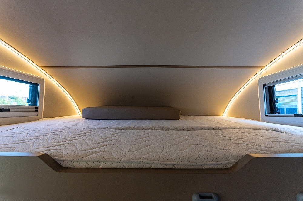 額頭床為抽拉式床板設計,白天不使用收起來后駕駛室在垂直方向更顯通透敞亮,兩側各配有一個外推窗,保證采光和通風效果,原車附送的高密度海綿床墊睡感舒適。