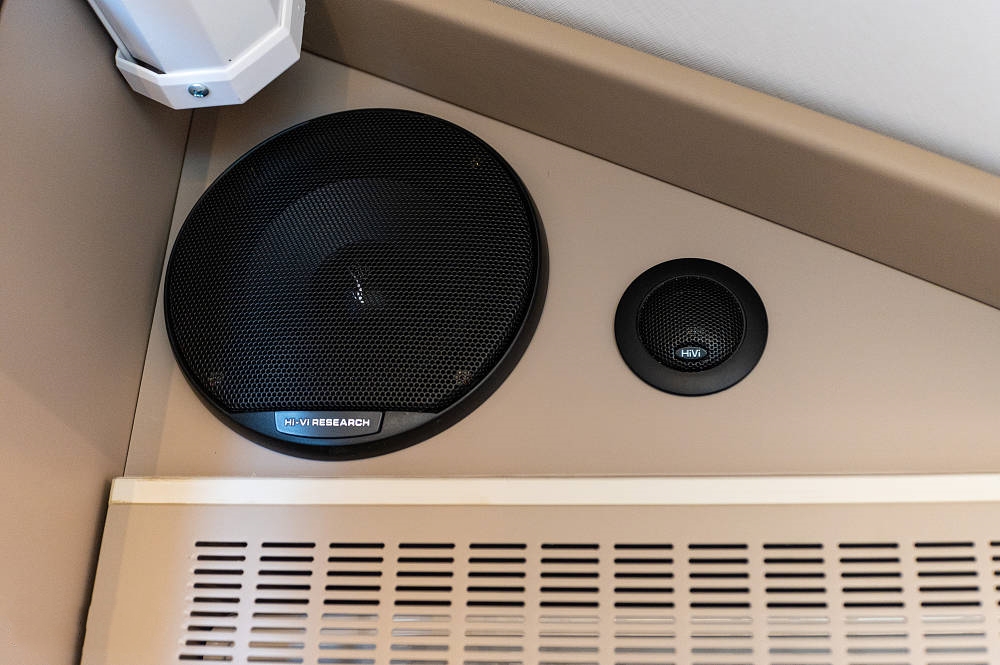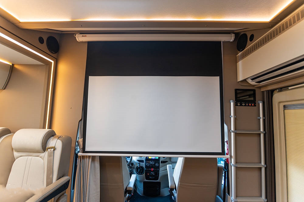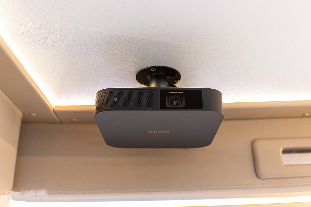 得益于雙拓展的寬大空間尺度,車廂配備了一套投影設備作為娛樂配置,包括極米投影儀和60英寸幕布;音響視聽方面,歐勝房車沒有吝惜成本,提供惠威車載音響。