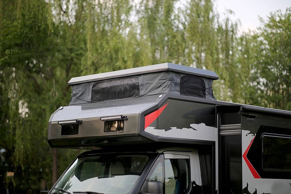 房車額頭部分采用獨家開發的局部升頂結構,不但賦予整車良好的通過性,更保障了額頭床的使用空間和駐車通透感。升頂部分采用雙層帳篷結構,外層為高質量透氣防雨布,內層為舒適海綿保溫層,通透性與保溫性兼具。當然,還能通過篷布窗戶進入到車頂位置,這樣更適合那些站在高處拍照的攝影愛好者,或者定期到車頂清理太陽能板的灰塵。