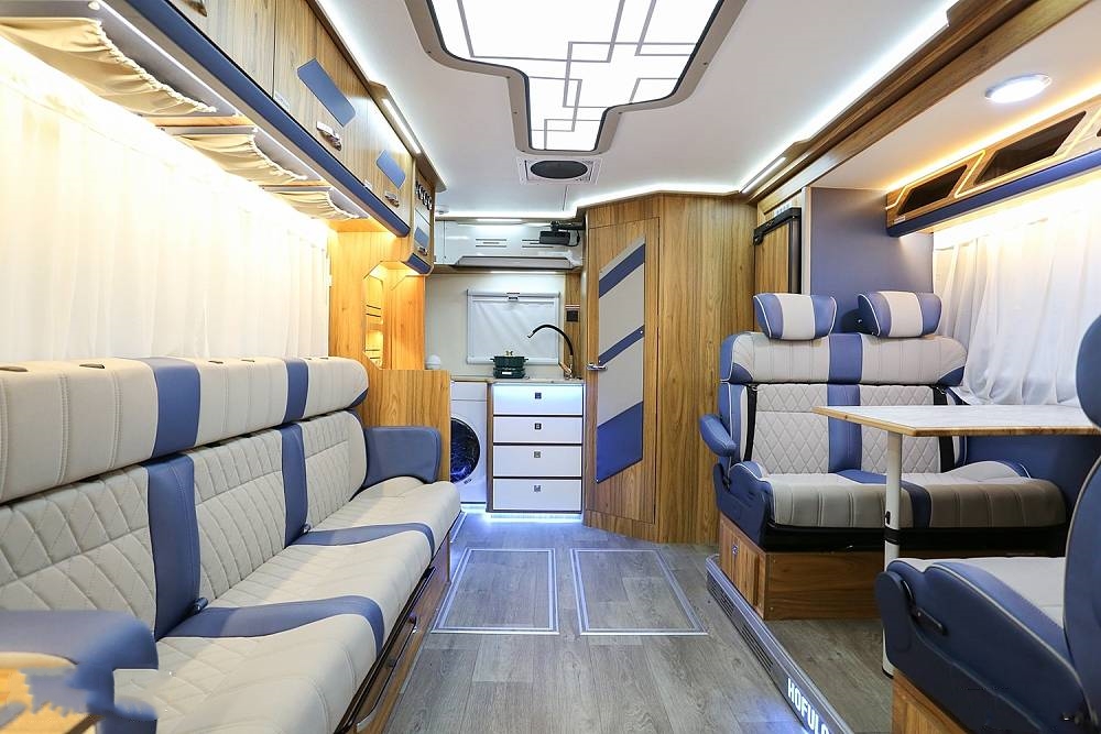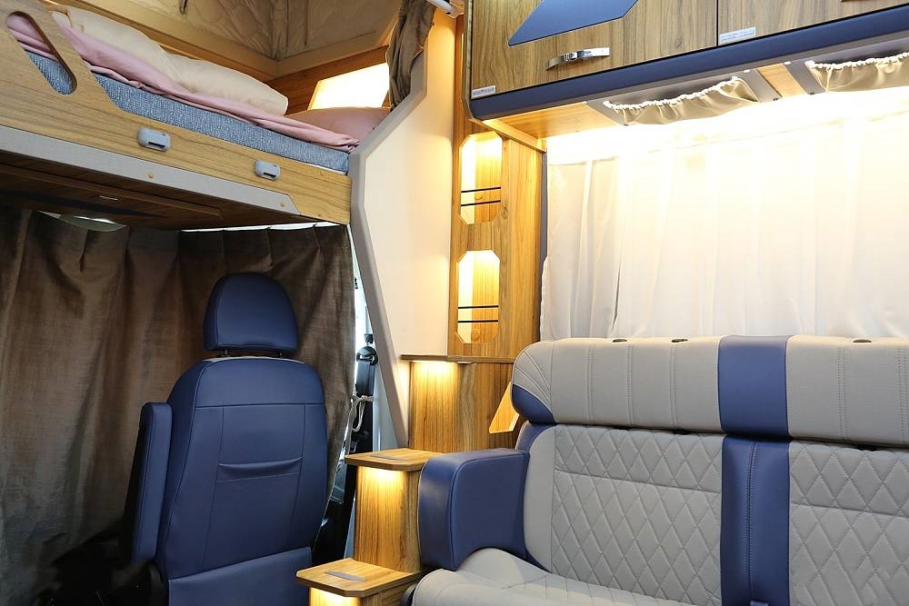 內飾方面,勇者房車內部采用藍白內飾風格作為全新的設計,有點海洋系的感覺。整體感覺來說,白藍配色觀感清新,加上原木色的板材飾面,更加原生態。吸頂式造型頂燈與四周吊柜造型相呼應,頂燈與氛圍燈帶相襯托的整體燈光效果,使得夜晚的車內空間充滿了居家溫馨感。布局方面,整車以額頭床+中置長條沙發+4人會客區+車尾廚房+衛生間布局,對于這款布局我們比較常見,但對于勇者這款房車來說,是第一次嘗試,側向沙發和4人會客區座椅全部來自于乘用車的座椅標準,安全性上得到了保證。