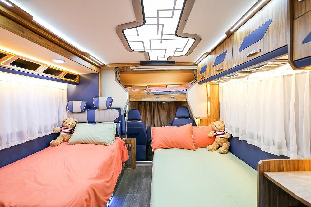 面對市場上眾多同級C型競品房車,論及拉花、彩條以及車身涂裝的個性化制作,依維柯這款全新車型絕對榜上有名。雖然進口依維柯底盤只是后驅系統,但這種足夠野性、也足夠讓人一見就能傾心的硬朗氣息,不免會把它當做四驅越野房車來對待。為了降低車身整體高度,勇者房車將軟升頂機構植入C型額頭位置,這樣它的最大高度控制在2990mm。