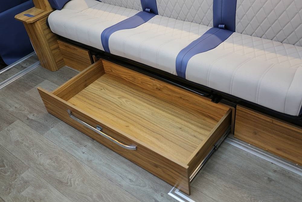 側向沙發座椅區完全按照乘用車座椅來設計的,拼床過程中稍微程序多一點,首先需要將后面的頭枕整體拿下來,再將座椅面外翻,靠背翻折,之后就轉換成了一張床位。長條沙發的底部是一款容積可觀的大抽屜。