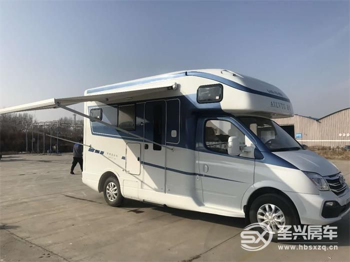 這款車的外觀主色為白色,搭配藍(lán)色拉花,整體給人優(yōu)雅靈動(dòng)的感覺。外部配備了:遮陽棚、外置廚房、外置儲(chǔ)物倉(cāng)、重力注水口、市電接口等設(shè)備,功能豐富。