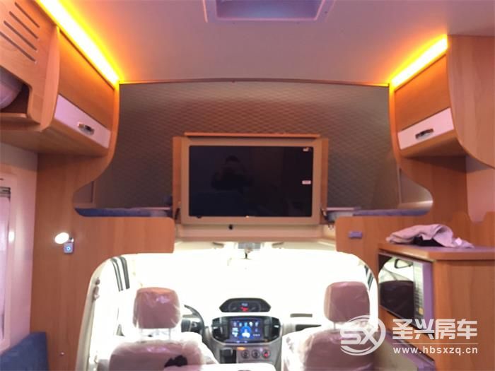 打開電動(dòng)踏步,進(jìn)入會(huì)客區(qū),會(huì)客區(qū)采用了L型卡座設(shè)計(jì),中間搭配升降餐桌。沙發(fā)采用了豪華布藝設(shè)計(jì),盡顯高端。在前方配備了32寸網(wǎng)絡(luò)液晶電視,讓您在旅途中也不耽誤追劇。