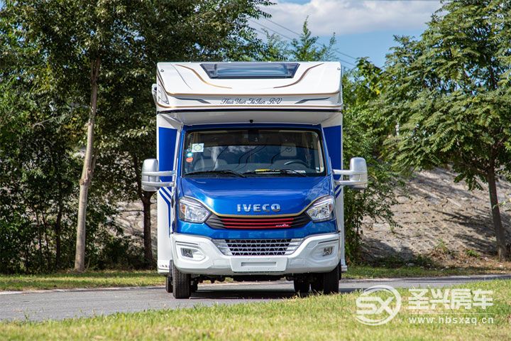 帥氣的外觀就是很多車友對其的一印象。時尚的小額頭造型與依維柯英俊的面孔搭配健美的身材一樣讓人著迷,寶藍色的車頭與科幻風的車身拉花配色更是錦上添花。外觀已如此用心,下面就一起了解這臺房車的細節。