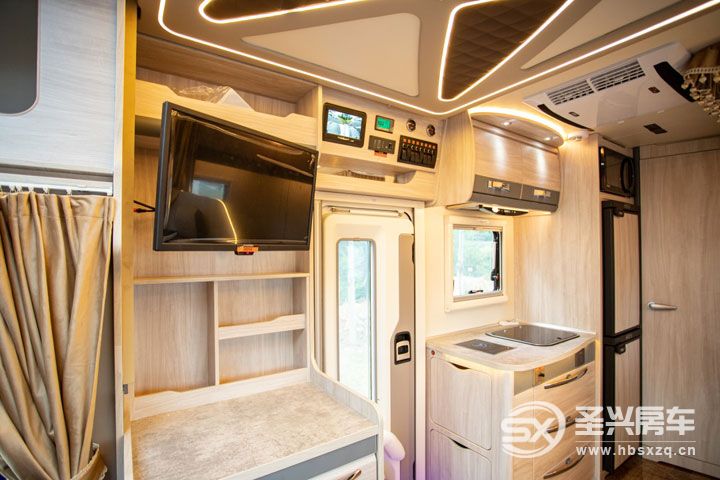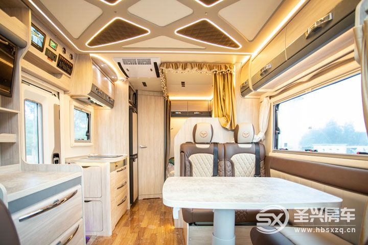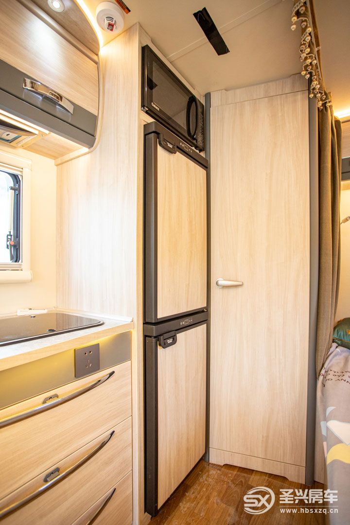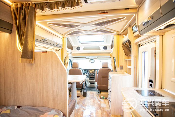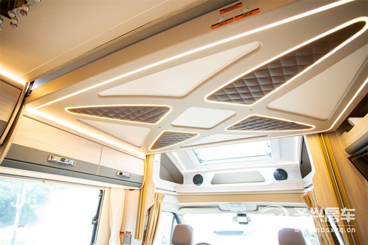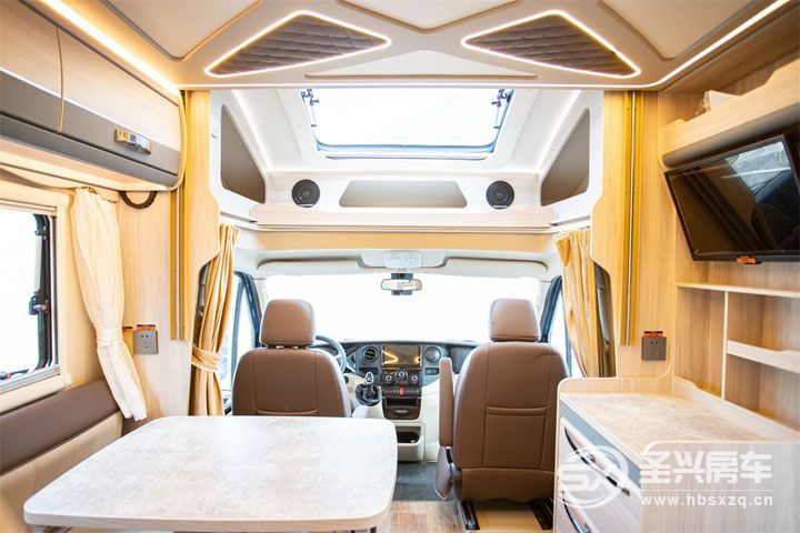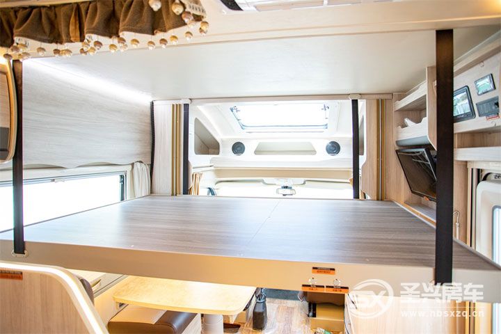 這臺S800在布局方面選擇了經典的后縱置床+吊床,在空間的利用和床位的數量上都有著獨特的考量。然后利用采光和木色紋理的暖色調讓旅行生活中充滿了活力和新鮮感。