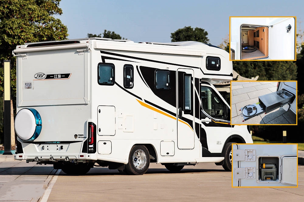 外部配置有德國斯彼得曼電動無支架3.5M遮陽棚、東泰電動踏步、外置柴油抽拉灶、貫通式儲物箱,通220V取電插座,外接注水口、戶外LED照明以及800W太陽能板等戶外常用設備。