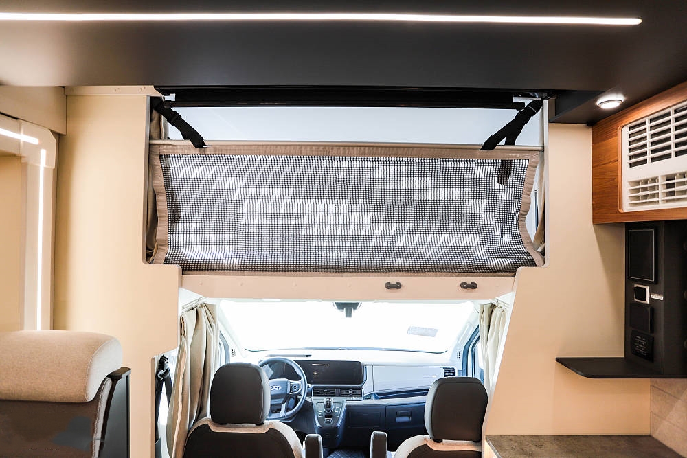 駕駛室上方是常見的大額頭雙人床,可以輕松睡下2名成年人,帶兒童防護網保證嬰幼兒睡眠安全,額頭床兩側各配有一個外推窗,保證采光和通風效果,原車附送全乳膠復合高回彈床墊睡感舒適。