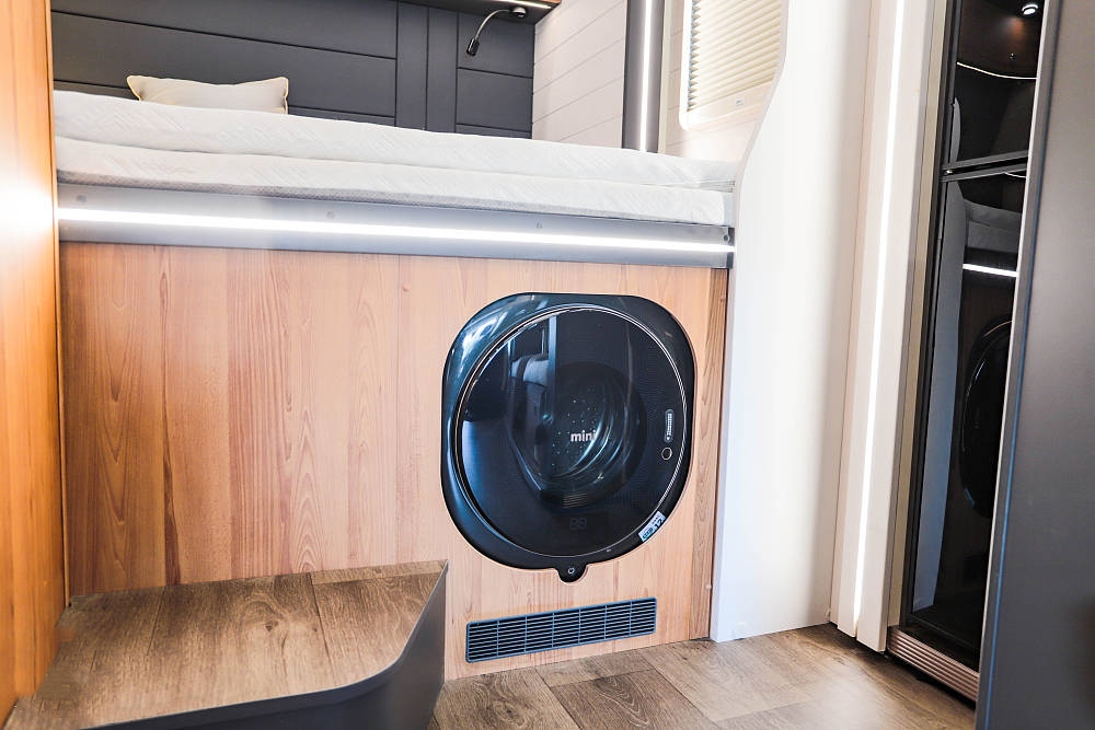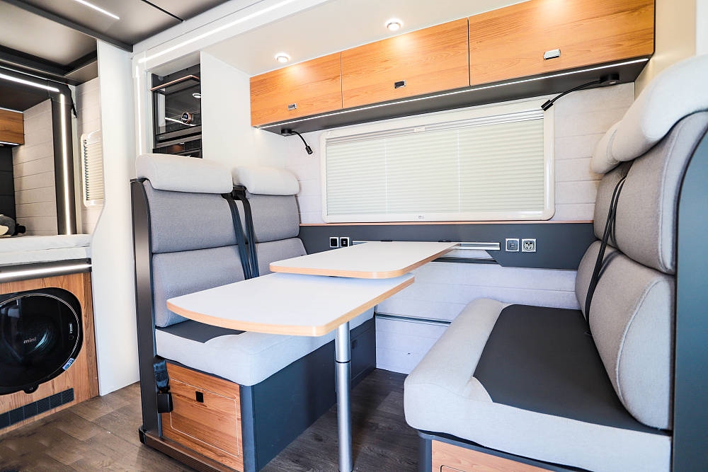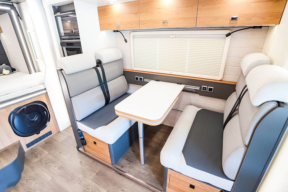 會客區橫向空間表現優異,餐桌表面是白色原木紋理并配備延長桌板,打開后更方便日常就餐娛樂;雙卡座沙發座椅下方內有乾坤,各內置一組大容積抽屜,充分利用零散空間提升儲物效率。餐桌降低后還可與沙發組合成一張臨時床鋪使用,超大尺寸外推窗為客廳提供足夠的采光和通風效果,同時也可以欣賞車外的風景,為旅途增添樂趣。