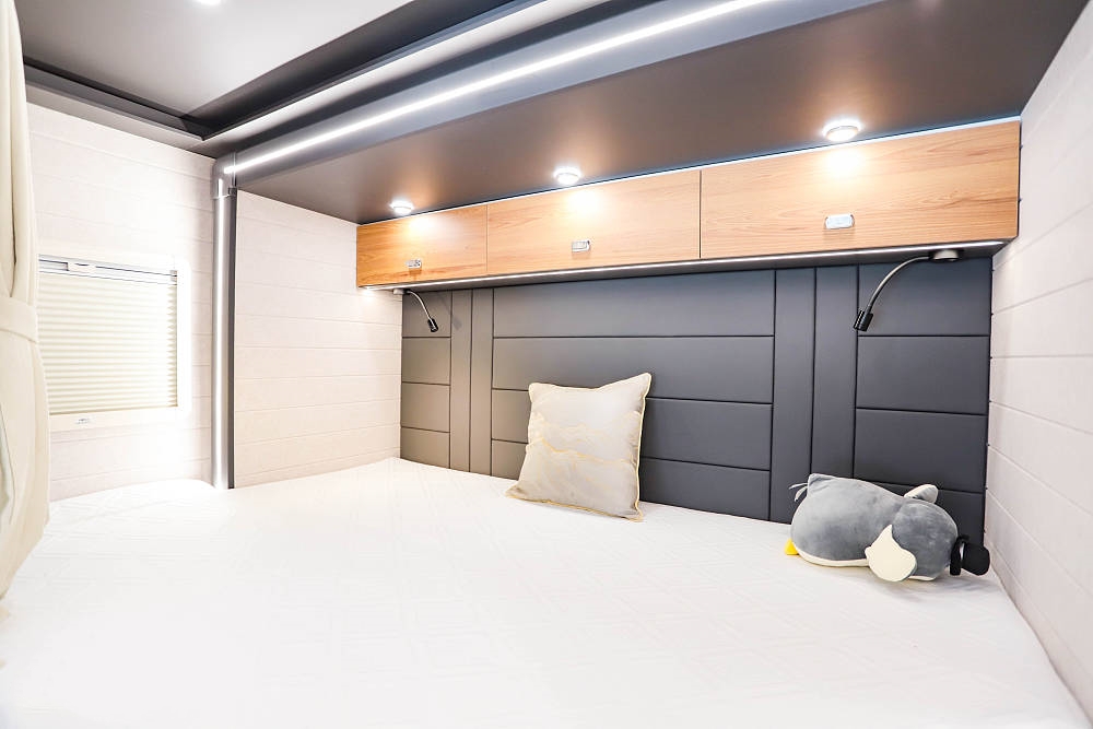 尾部拓展增加了車長,藍牌房車亦可擁有寬闊雙人床,提供一張2.1米*1.9米的超寬雙人床,室內設計貼心溫馨,仿佛家中臥房一般。旅途與居家體驗再難區分,讓每一次旅程都成為您生活中的一部分。橫置大床布局能保證舒適的睡眠空間和充足的儲物空間。床鋪兩側設有外推窗,為臥室提供良好的采光和通風效果,上方的多組儲物衣柜方便收納衣物和其他物品。