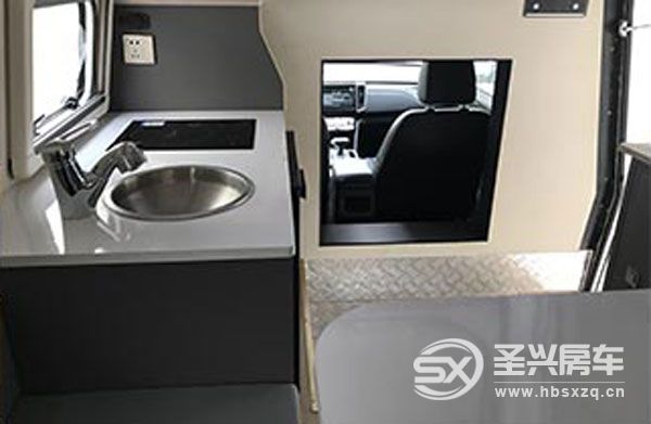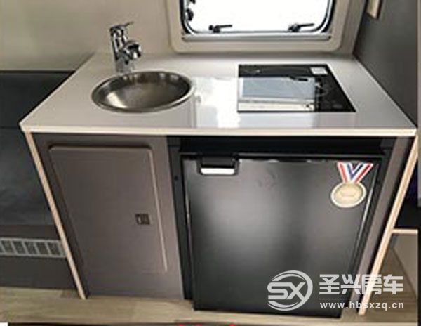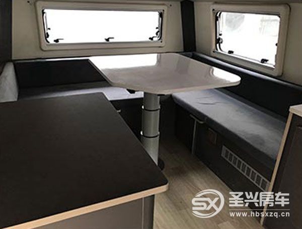 生活區區域可以看到,有洗手盆、電磁爐、車載冰箱,一組環形沙發,可以升降的餐桌,組成一張大床,容納兩個人休息。