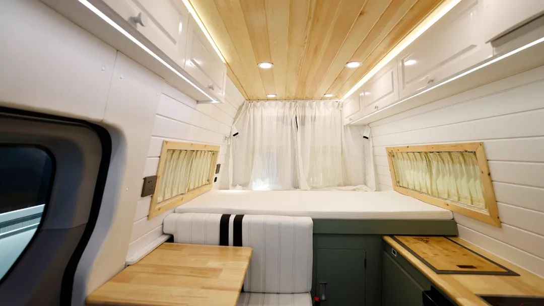 來到車內(nèi),這款是主流的露營車裝飾風(fēng)格,實木條裝飾側(cè)壁和天花板,燈光系統(tǒng)選用燈帶結(jié)合小圓形頂燈的組合,車內(nèi)的燈光亮度非常高,這是我體驗之后非常喜歡的一點。布局也非常簡單,駕駛室后方是一款中前置的衛(wèi)生間,中部是廚房和中置小客廳,車尾就是一張可靈活轉(zhuǎn)換的大雙人床。如此一來,整車可以做到核載4人,滿足2人睡眠。