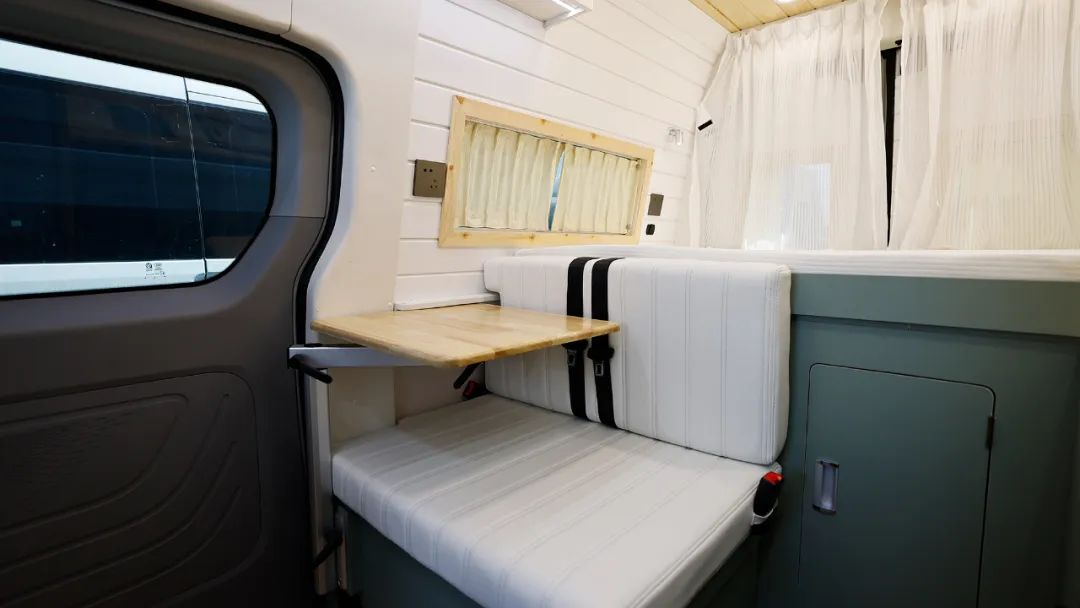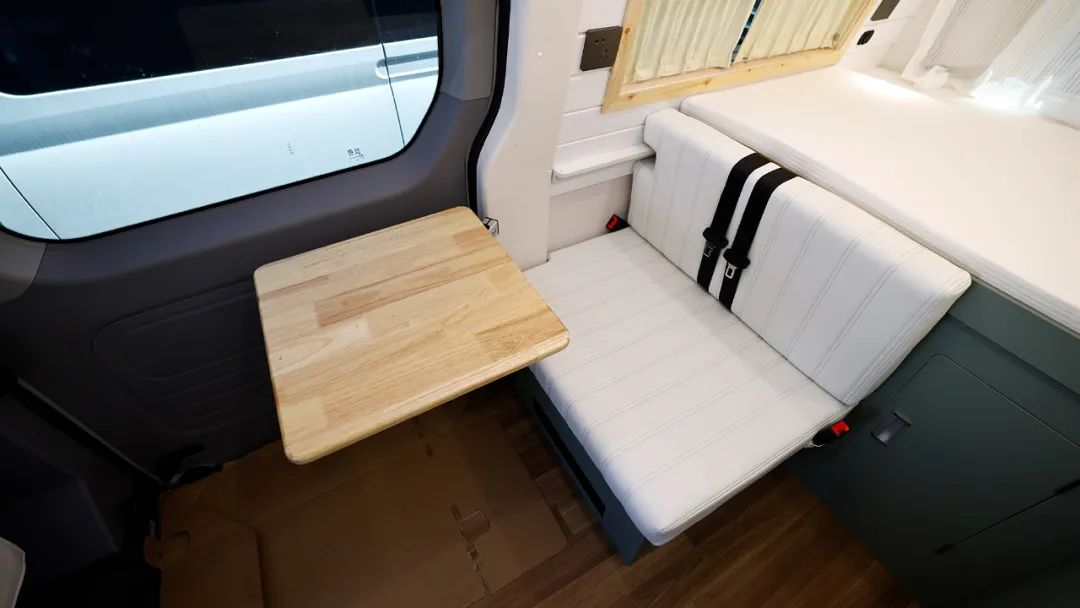 車輛中間滑動門打開之后,正對著的就是這款小型會客區(qū),它由單排雙人卡座和一款多角度可調(diào)節(jié)的餐桌組成,對于卡座來說,它的重要性在于滿足2人的合法乘坐,實際體驗中乘坐兩名成年人還是稍有些局促,一般來說一個人乘坐就舒服多了。卡座的靠背是可以直接取下來的,便于晚上轉(zhuǎn)換床位使用。