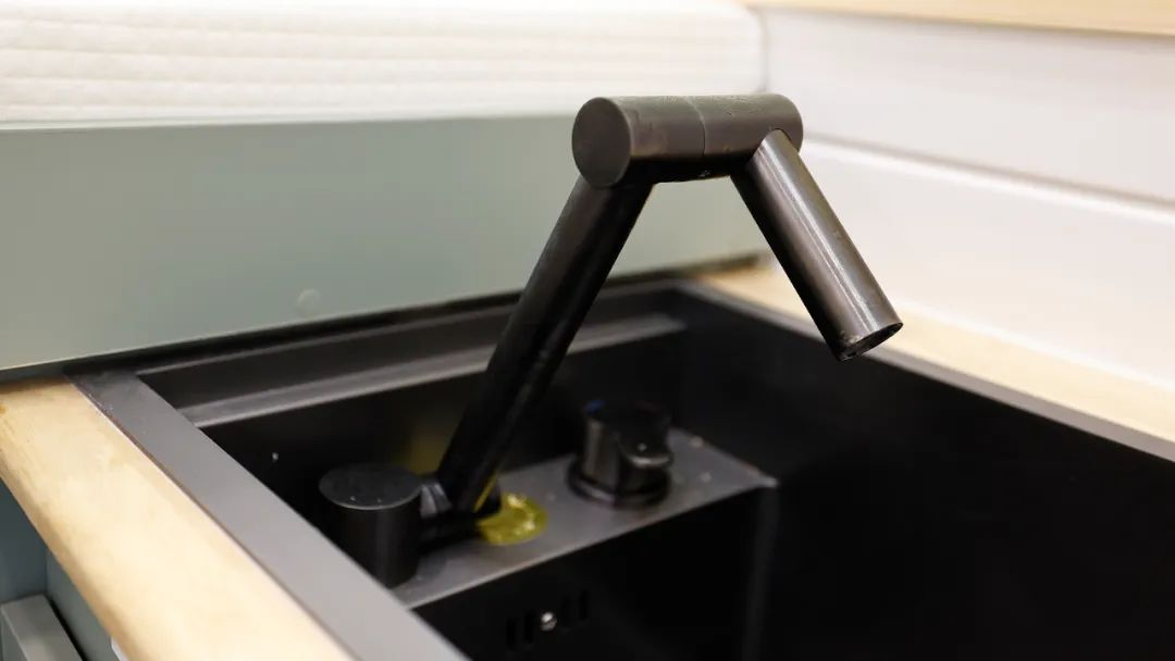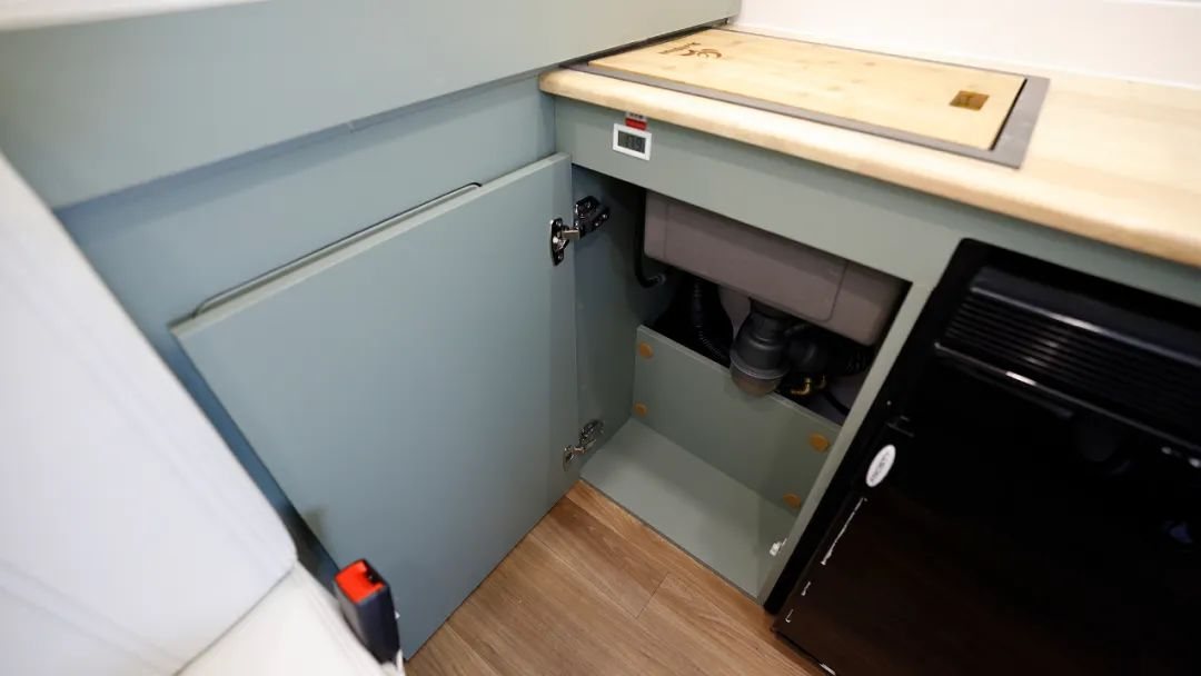 廚房位置介于衛(wèi)生間和后床之間,廚房臺面適中,畢竟作為一款緊湊型的車型,滿足了各項配置,它的空間就會被壓縮。廚房操作臺上配備了一款比較實用的方形洗菜池,深度不錯,多角度可調(diào)節(jié)的水龍頭也比較實用。臺面的右側(cè)是一款800W電磁爐,用于日常燒水或者是煮面等簡餐使用,重油煙的烹飪還是放在車外吧!櫥柜之內(nèi)包含了一個單間儲物格和一款70升車載冰箱,滿足于日常的儲物和保鮮。