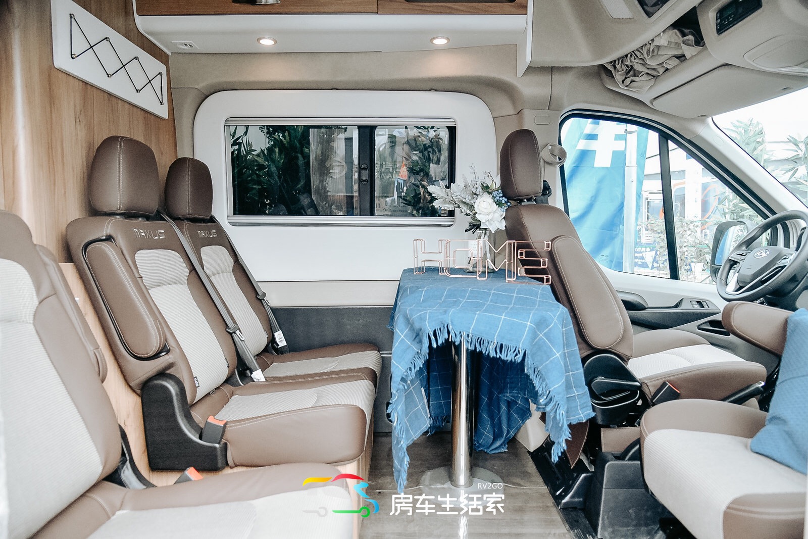 RV90 B型還具備多項業界首創優勢,在首次采用的全新設計、行業領先的智享科技、更關注出行安全的智全安心、注重消費者體驗的舒享升級、關注實際應用需求的惠享便捷等方面表現出色。RV90 B型在外形設計上進行了升級,智聚八方鍍鉻前臉取代了原本的飛翼式前臉,外觀提供5種配色供選擇,滿足個性化需求。進入RV90 B型房車內部,全新的內飾風格以及流行配色打造出時尚感,自主研發的隨動式紗門開啟方式具備更好的通過性和更通透的乘坐體驗。電視機內嵌固定于頂飾板,形成了簡潔美觀的一體式電視墻。在智享科技方面,RV90 B型搭載了ADAS智能駕駛輔助系統,保障行車安全。首創搭配自動感應全LED大燈,全景攝像頭,自動感應雨刷。超行業標準的防腐設計,有效保證白車身10年不銹穿以及避免外板邊界銹蝕。