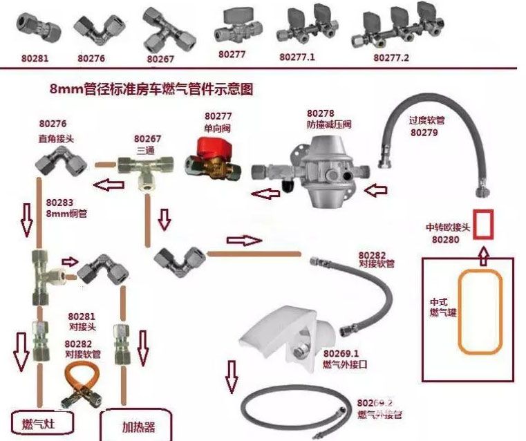 上圖是房車燃氣系統的管路示意圖,可以看到氣壓調節器的作用是非常重要的,從氣罐出來的氣體必須先連接到氣壓調節器,通過氣壓調節器之后再分配,然后輸送到各個使用燃氣設備的端口,所以燃氣調節器就像是一個忠誠的衛士一樣,始終在一線站崗。