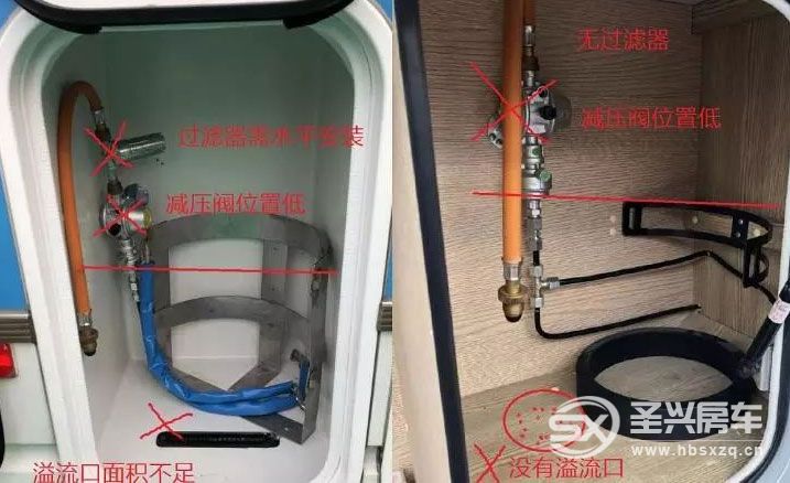 ⑤燃氣艙——存放氣罐的空間,設計時要遵循專業標準,必須與車內密閉隔離,且在底部開溢流口,總面積不小于100平方厘米,由于液化石油氣的密度大,即使有泄漏也會通過底部溢流口排到車外,不會對車內人員造成危險。
