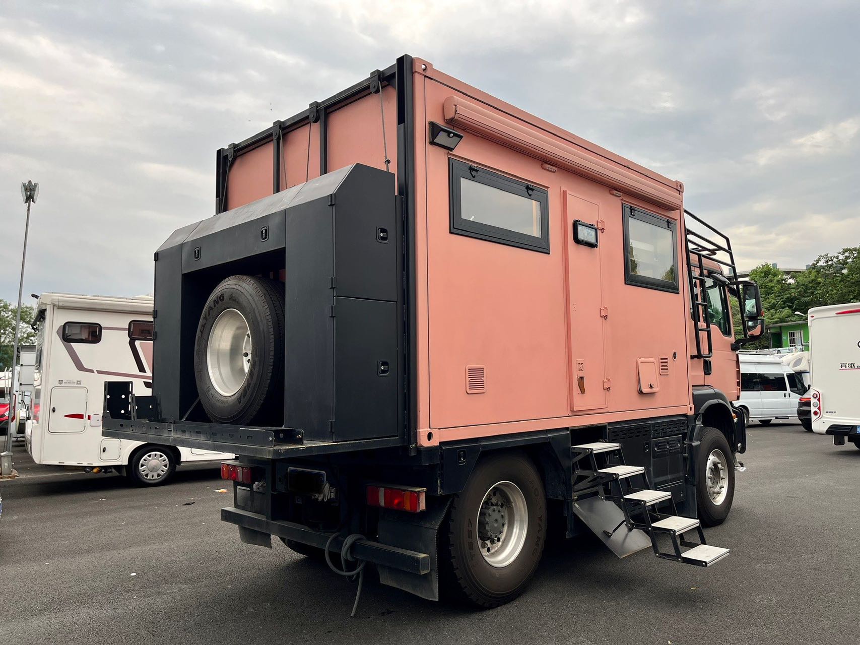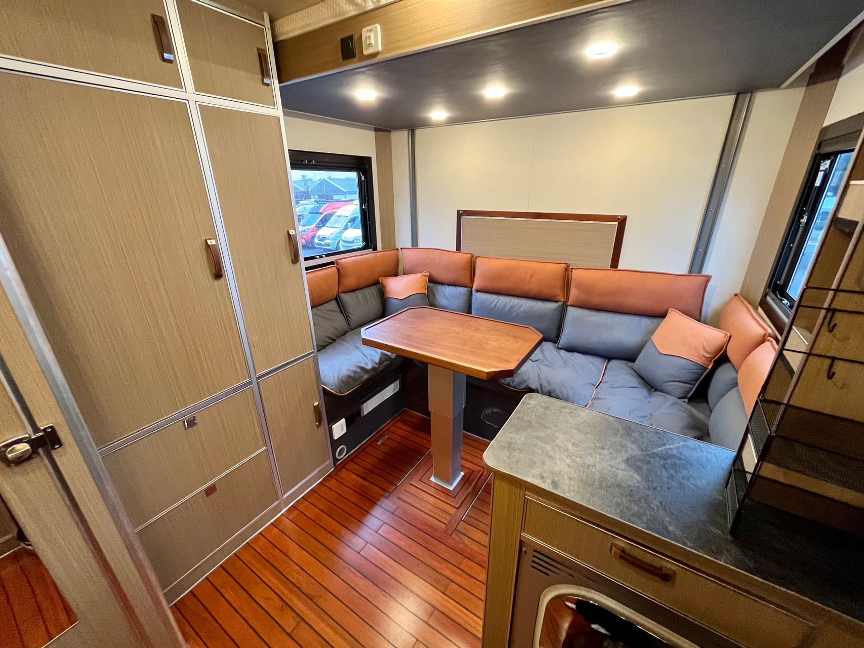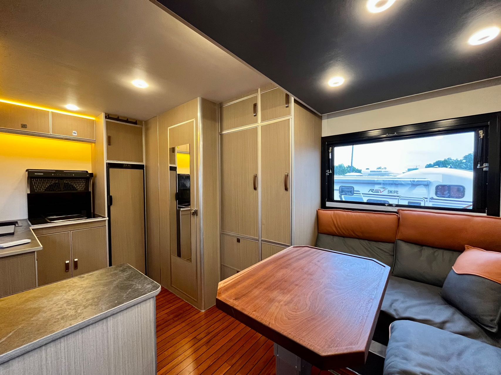 【戶外配置】:220V市電接口,重力加水口,電動戶外遮陽棚,中門密碼鎖,五階上車踏步,電動升降儲物箱和摩托車架,車頂射燈