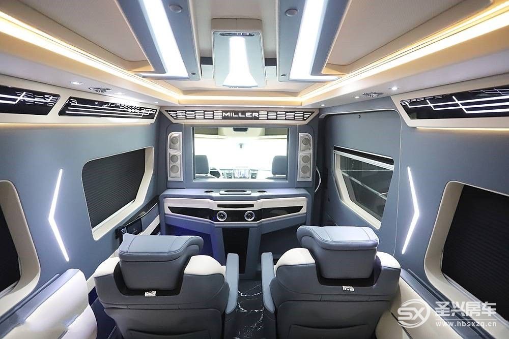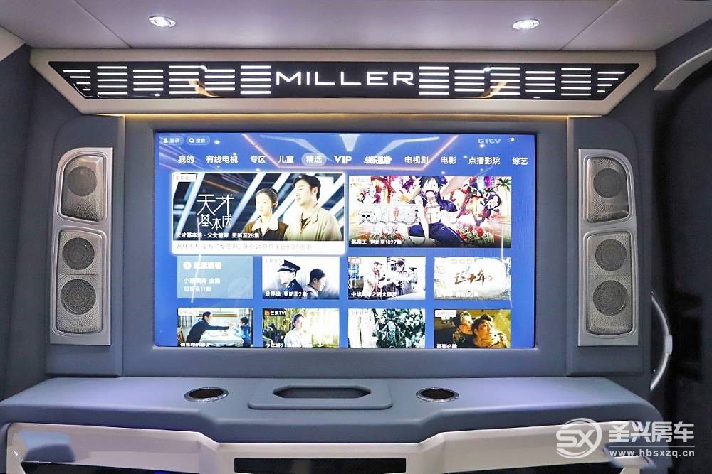 生活區(qū)與駕駛室通過屏障隔開,中間位置既是通艙窗口,升降電視也在該區(qū)域,兩側(cè)配備包括低音、中音、高音等多組揚聲器,可為車內(nèi)帶來更高級的音樂質(zhì)感。