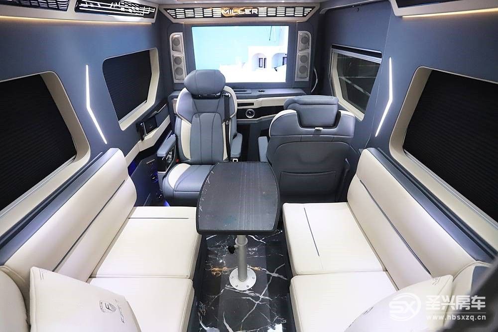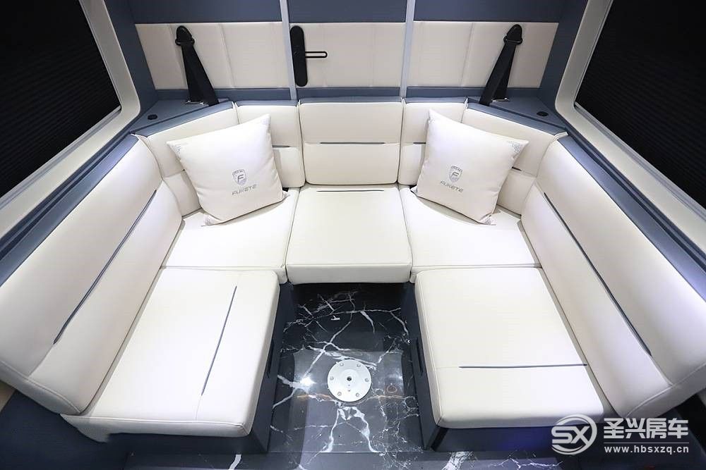 商旅車即商務(wù)、旅居車型于一身,福客特征服者內(nèi)部布局包括前置商務(wù)座、中置會客區(qū)、尾置廚衛(wèi)區(qū),其中會客區(qū)支持拼接床鋪,駐車時可供用戶休息。