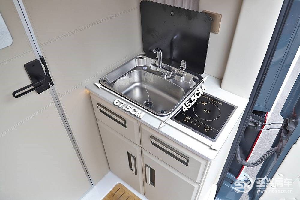 先來看廚房區(qū),操作臺面實測面積為67.5x45.5(cm),內(nèi)部嵌入了電磁爐和帶蓋洗手池,如果將尾門打開,可為廚房區(qū)通風(fēng)換氣。