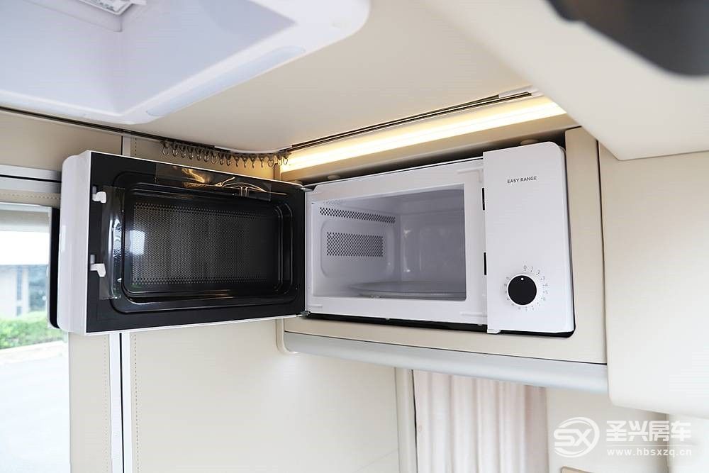 廚房區(qū)臺面上方配有微波爐,有助于用戶加熱簡餐。