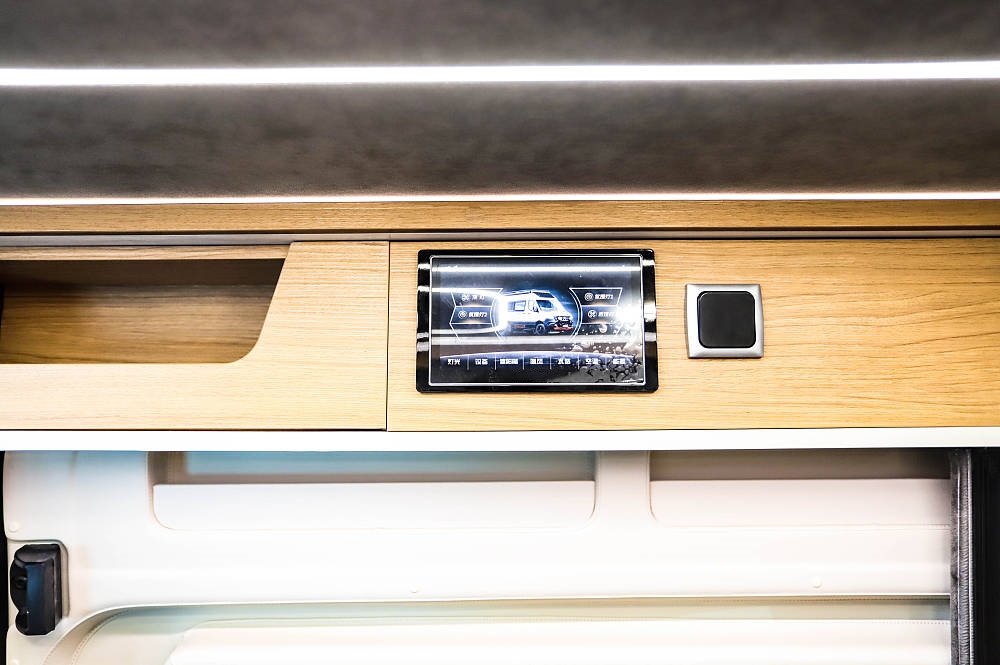 尾部可以看作全車最大的儲物空間,中間通道方便放置大件行李物品,不過尾部設(shè)有一節(jié)門檻,并不能和生活區(qū)形成純平臺面。另外在柜門內(nèi)部也設(shè)計了一定儲物空間,另一側(cè)的獨立照明燈方便用戶在夜間尋找物品。