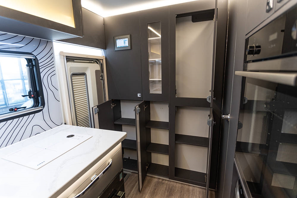 來到車廂中后部就是功能完備的廚房區(qū),白色石英石定制臺面之上配備了內(nèi)嵌式電陶爐、不銹鋼折疊式洗菜池,灶臺下方為多個(gè)廚具儲物抽屜、2個(gè)標(biāo)準(zhǔn)電源插板和洗碗機(jī),上方為一組三段式儲物吊柜。