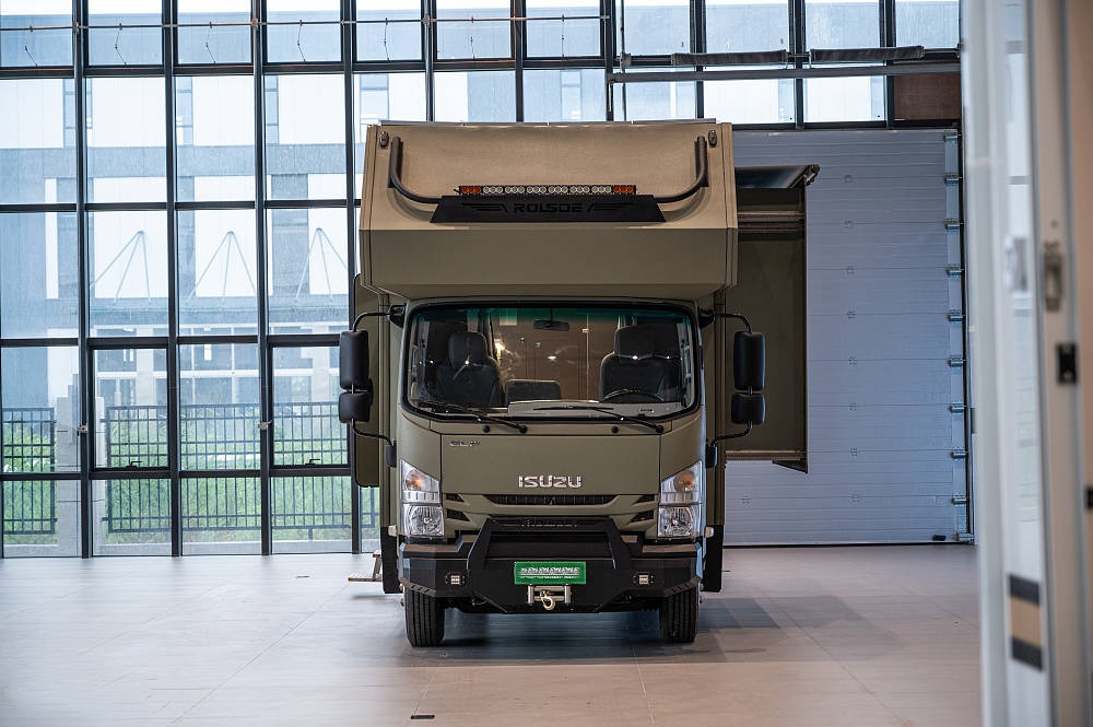 五十鈴700P房車大量使用標(biāo)志性的硬派越野元素和棱角分明的方形線條設(shè)計(jì),全車噴涂軍綠色中顆粒防爆漆給人一種堅(jiān)固耐用的直觀感受,方正的車身輪廓也更適合提供更多的空間和載重能力。